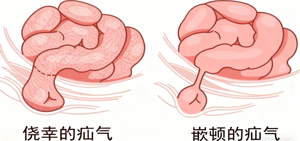 许多患者认为疝气“不痛不痒,影响不大”,因而迟迟不就医。然而,疝气包块会随着时间推移逐渐增大,坠胀感也会加重。最危险的情况是发生“嵌顿疝”——即突出的肠管等组织被卡在缺损处无法回纳。嵌顿疝是一种普外科急腹症。被卡压的组织会因血液供应受阻而肿胀、缺血,短短数小时内就可能坏死、穿孔,引发严重的腹膜炎、感染性休克,直接危及患者生命。此时再行急诊手术,不仅难度大增,术后并发症风险也显著升高。