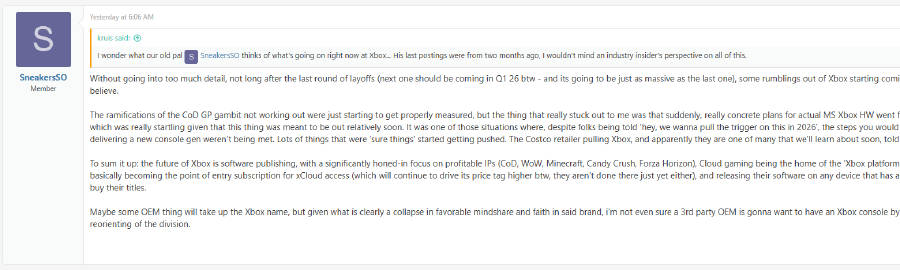 据 Insider Gaming 报道,近日曾成功爆料微软Xbox相关情报的舅舅党SneakersSO在社区发帖称,微软计划未来将重心转向游戏发行而不是硬件开发,2026年第一季度将进行大规模裁员,下一代Xbox游戏机也很可能取消开发,甚至是永远无法实现。